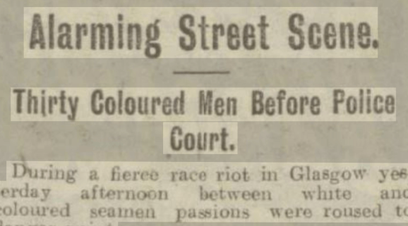 In contrast, BNA papers had from 1919 used the label to denote disturbances in Britain. One of the first outbreaks during that year was reported on 24 January in the Dundee Evening Telegraph as a ‘Fierce Race Riot’ in Glasgow. The violence broke out over competition for work, as it was thought that black sailors were given preference in signing on for a ship about to sail. This caused resentment among white sailors, who also believed that the black men accepted lower wages. It resulted in a scuffle, during which a black sailor was reported to have fired a revolver, injuring a white man in the neck, and a ‘white’ contingent charged the black men. According to the report, the white mob was armed, some with guns. Bottles and stones were thrown at the retreating black sailors and the windows of their lodging house.