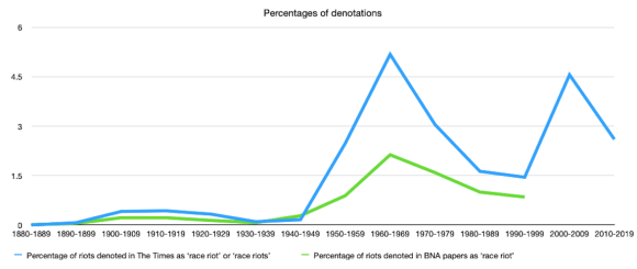 This image shows that before 1949 the percentage of ‘riots’ denoted in The Times as ‘race riot’ or ‘race riots’ remained under one percent, with the peak in 1910-1919, corresponding with the peak of ‘riot’ in 1910-1919. After 1949 the percentage in The Times rose sharply to well above one percent, peaking in 1960-1969. The percentage of ‘riots’ denoted in BNA papers as ‘race riot’ stayed under one percent until 1960, with the peak in 1950-1959. From 1949 the BNA percentage rose to 1960-1969, after that it dropped but remained well above the pre-1950 figures. The image also illustrates that after 1890, except for the decade from 1940 to 1949, The Times published relatively more articles on ‘race riots’ than BNA papers.