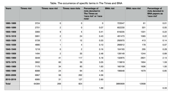 In short, ‘riot’ appeared on average daily in The Times and frequently in BNA papers. Only small percentages of these articles were about ‘race riots’, with higher proportions in The Times than BNA papers. Peaks in the usage of ‘race riot’ occurred during the decades 1910-1919, 1950-1959 and 1960-1969.